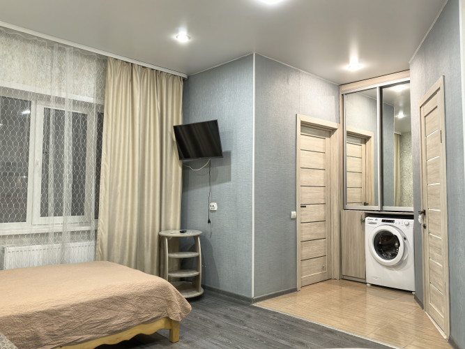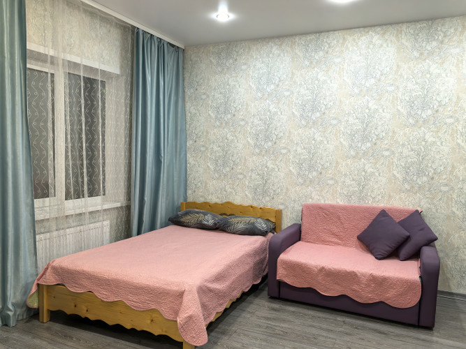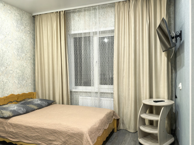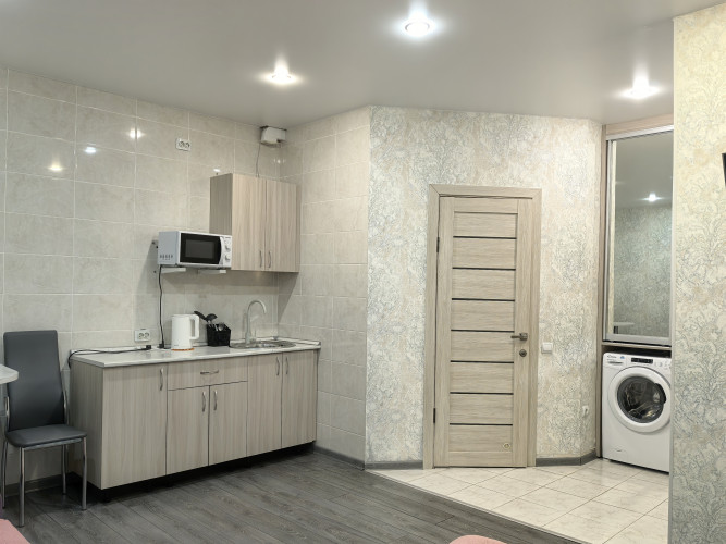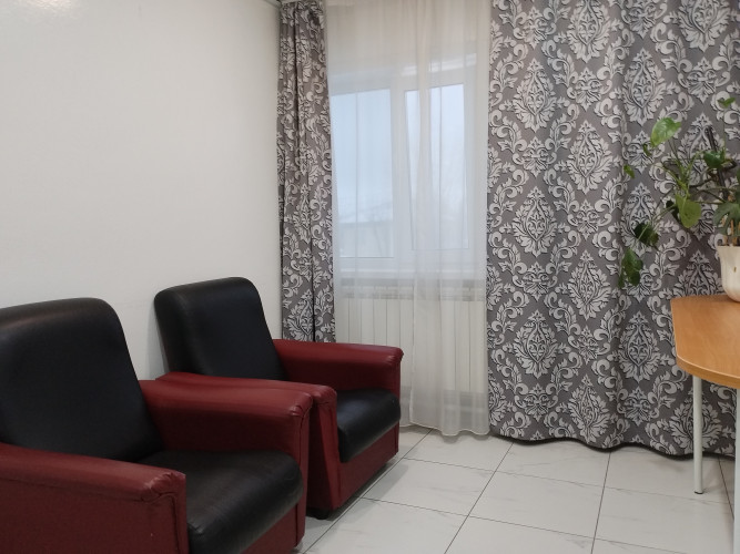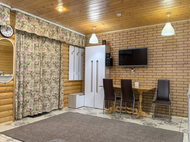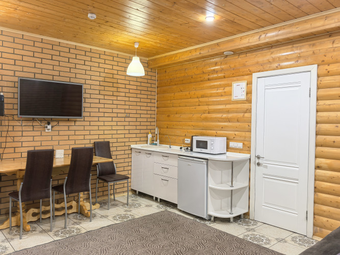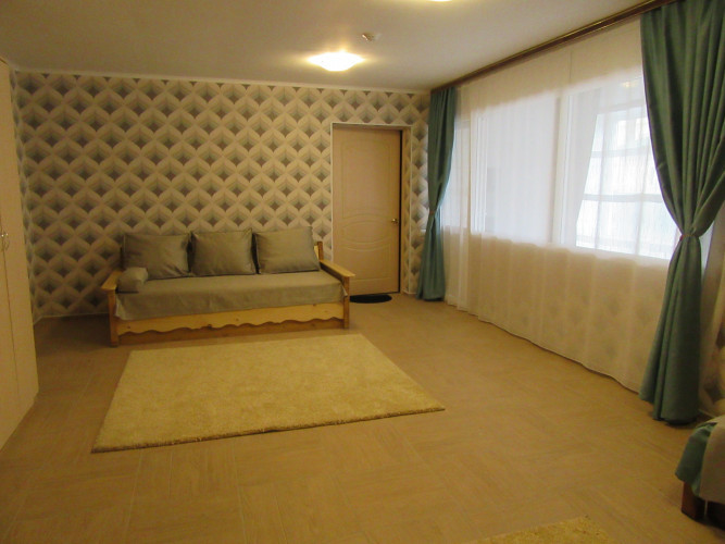 Двухкомнатный номер с изолированными комнатами, рассчитана max на 5 спальных мест, есть балкон, кухня 20 м кв., просторная гардеробная, душ и сан. узел в номере. В номере: кровать 2-х спальная, диван и 2-односпальные кровати, стол, 5 стульев, шкаф для одежды холодильник, микроволновая печь, плита, чайник, стиральная машина, фен, посуда, кабельное телевидение, телевизор, wi-fi - бесплатно, теплые полы, бесплатная охраняемая парковка на территории, по запросу завтраки и ужины (с доплатой и доставкой). Дополнительные услуги: прачечная.