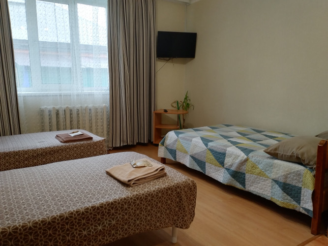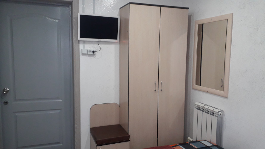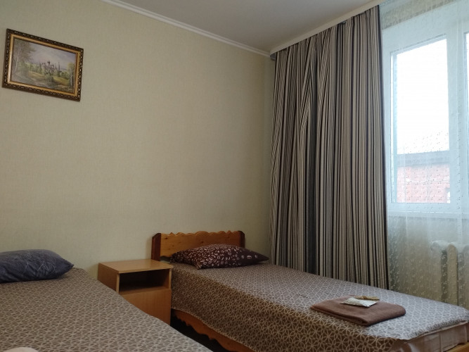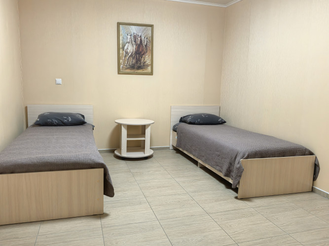 2-односпальные кровати, стол, два стула, телевизор, шкаф для одежды, санузел и душ на этаже. Wi-fi беспроводной интернет бесплатно, есть общий балкон — место для курения, бесплатная охраняемая парковка на территории, по запросу завтраки и ужины (с доплатой). Дополнительные услуги: прачечная.